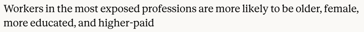 Professions with the most replaceable work — not the widest range of tasks that can be performed but in which most of the work can be automated by AI — are broadcast news analysts, word processors and business intelligence analysts. Anthopic’s summary of the workforce demographics at greatest risk: