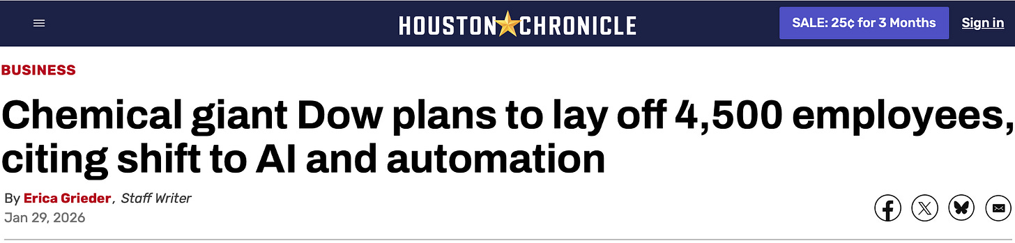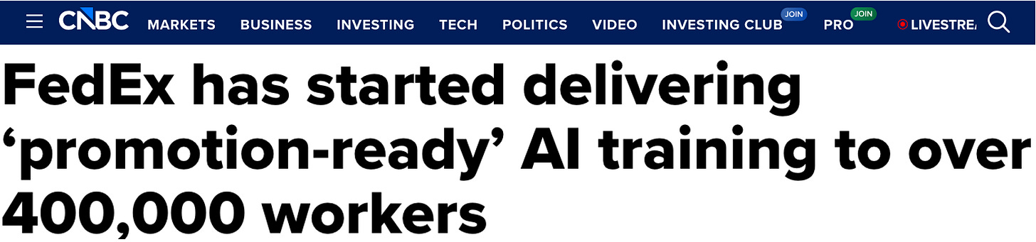 A few things stand out. Going forward there will be two kinds of people: those who use AI and those who don’t have jobs. In impacted industries, already pressure must be immense. FedEx, notably did not announce layoffs, but just launched a huge AI training campaign. The cynical part of me — the Wall Street bro — says, employee participation in this program will determine who gets sacked and who doesn’t when they do the inevitable. US Postal, of course, will get around to AI just as soon as the government sorts out a Central Bank Digital Currency — which will be never.