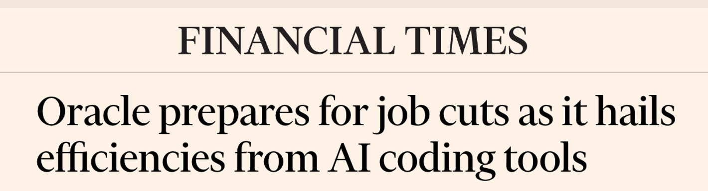 Software is the the first language of an LLM, before English, and, looking at AI adoption among programmers, one might expect layoffs. Oracle just did it.